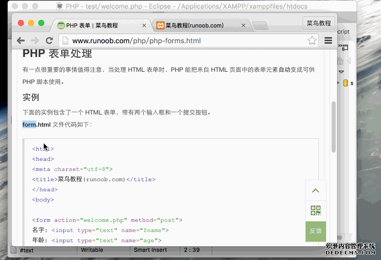 在 PHP 中,预定义的 $_POST 变量用于收集来自 method="post" 的表单中的值。 $_POST 变量预定义的 $_POST 变量用于收集来自 method="post" 的表单中的值。 从带有 POST 方法的表单发送的信息,对任何人都是不可见的(不会显示在浏览器的地址栏),并且对发送信息的量也没有限制。 注释:然而,默认情况下,POST 方法的发送信息的量最大值为 8 MB(可通过设置 php.ini 文件中的 post_max_size 进行更改)。 实例form.html 文件代码如下: 当用户点击 "提交" 按钮时,URL 类似如下所示: "welcome.php" 文件现在可以通过 $_POST 变量来收集表单数据了(请注意,表单域的名称会自动成为 $_POST 数组中的键): 通过浏览器访问演示如下: